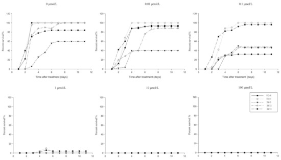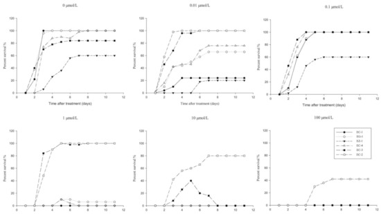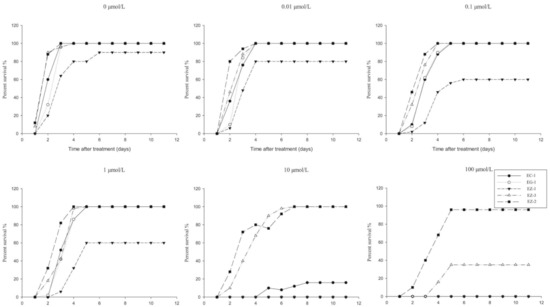 Percentage of daily survival of various groups at different metamifop concentrations (%).