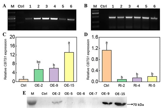 The CBTS1 gene-overexpressing and gene-silencing plants were developed using the agrobacterium-mediated transformation method. Twenty CBTS1 overexpression lines (CBTS1-OE, expressing Flag-tagged CBTS1 protein) and 15 CBTS1 silencing lines (CBTS1-RI) were obtained. The genomic PCR results showed that an expected 1 kb fragment could be amplified from the CBTS1-OE lines, and that an expected 392 bp fragment could be amplified from the CBTS1-RI lines, whereas neither of these fragments could be amplified from control (empty-vector transformed) plants (Figure 1A,B). Further qRT-PCR analyses showed that the expression of the CBTS1 gene in CBTS1-OE plants was 5–13 times higher than that in control plants (Figure 1C). Line #15 of the CBTS1-OE plants had the highest abundance of transcripts of CBTS1 (Figure 1C). The expression of the CBTS1 gene was decreased by 80–92% in the lines #2, #4, and #5 of the CBTS1-RI plants compares with that in control plants. The expression of CBTS1 was the most suppressed in the line #2 of the CBTS1-RI plants (Figure 1D). The CBTS1-OE plants were further identified by Western blotting using an anti-Flag antibody. The 70 kDa CBTS1 protein could be detected in the CBTS1-OE line #2, #9, and #15, but could not be detected in control plants (Figure 1E). The CBTS1-OE lines with detectable CBTS1 protein and the CBTS1-RI lines with CBTS1 expression suppressed by over 80% were selected for further analyses.