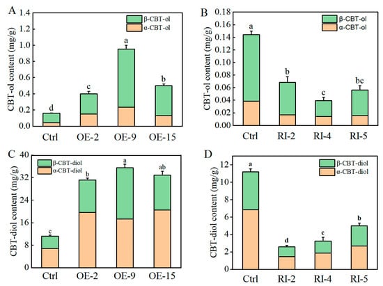 Determination of cembranoid content in the transgenic plants. (A,B) The histograms of CBT-ol contents in CBTS1-OE (A) and CBTS1-RI (B) plants. (C,D) The histograms of CBT-diol contents in the CBTS1-OE (C) and CBTS1-RI (D) plants. Lowercase letters indicate significant differences from control plants (p < 0.05, n = 3).