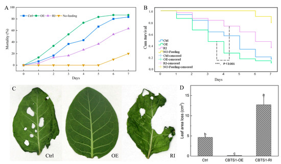 In order to evaluate the effect of the CBTS1 expression level changes on tobacco resistance to insect pests, the CBTS1-OE and CBTS1-RI plants were subjected to an insect pest challenge with S. frugiperda, and the empty vector transformed plants were used as controls. The second-instar larvae of S. frugiperda were continuously fed with tobacco leaf samples for 7 days, and the daily mortality of S. frugiperda were recorded for each experiment. After 4 days of feeding, 73% (22 of 30) of the larvae fed with tobacco leaves from the CBTS1-OE plants died, while only 43% (13 of 30) of those fed with tobacco leaves from control plants died (Figure 3A). The results showed that feeding with the leaves from CBTS1-OE plants significantly increased the mortality of the second-instar larvae of S. frugiperda. On the contrary, the larvae fed with tobacco leaves from CBTS1-RI plants had only 27% (8 of 30) of them died (Figure 3A). In the feeding preference test, measurement of the change in leaf area showed that the larvae feeding caused a leaf area loss of 0.16 cm2 for the CBTS1-OE plants and a leaf area loss of 12.71 cm2 for the CBTS1-RI plants, while it caused a leaf area loss of 4.64 cm2 for the control plants (Figure 3C,D). Kaplan–Meier survival analysis showed that the median survival times for the larvae feeding on leaves from control, CBTS1-OE, and CBTS1-RI plants were 5, 3(−2), and 6(+1) days, respectively, showing significant differences in the survival rates. These tests evidenced that manipulation of CBTS1 expression altered tobacco resistance to the insect pest S. frugiperda.