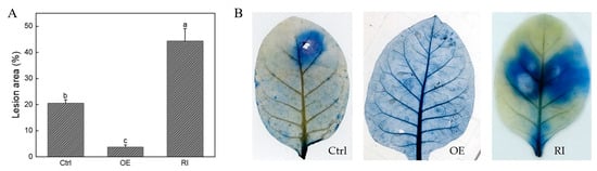 Pathogen resistance of the transgenic plants to P. nicotianae. (A) P. nicotianae-infected leaf area. Lowercase letters indicate significant differences from control plants (Tukey test, p < 0.05, n = 3). (B) Trypan-blue-stained tobacco leaves after P. nicotianae infection. Ctrl, control plants; OE, CBTS1-OE plants; RI, CBTS1-RI plants. The image for CBTS1-OE plant was from line #9 and that for CBTS1-RI plant was from line #4.