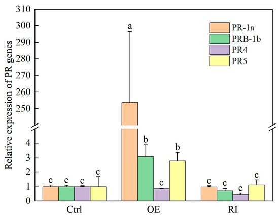 Relative expression levels of PR genes in the transgenic plants. Ctrl, control plants; OE, CBTS1-OE plants; RI, CBTS1-RI plants. Expression of each gene in control plants was set as ‘1′. Data are shown as mean ± SD. Lowercase letters indicate significant differences from control plants (Tukey test, p < 0.05, n = 3).