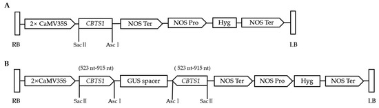 Schematic diagrams of the vectors for tobacco transformation. (A) Schematic diagram of the T-DNA region of pMDC-CBTS1-FLAG vector. (B) Schematic diagram of the T-DNA region of pMDC-CBTS1-RI vector. LB: left border; RB: right border; Hyg: hygromycin resistance gene; Pro: promoter; Ter: terminator; GUS: β-glucuronidase gene.