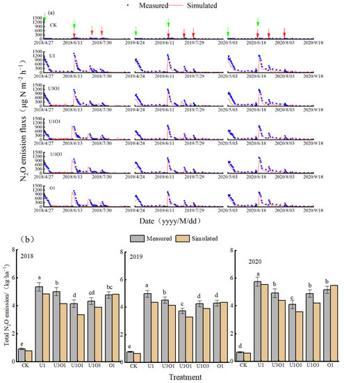 - Cui, F.; Yan, G.X.; Zhou, Z.X.; Zheng, X.H.; Deng, J. Annual emissions of nitrous oxide and nitric oxide from a wheat–maize cropping system on a silt loam calcareous soil in the North China Plain. Soil Biol. Biochem. 2012, 48, 10–19. [Google Scholar] [CrossRef]