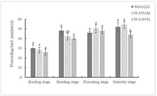 The number of protruding barbs in awns at four stages of three accessions. W610220, long awn, PI 655186, medium awn, PI 619592, short awn. Error bars represent mean ± standard deviation. Different normal letters mean significant differences among different treatments at 0.05 level.
