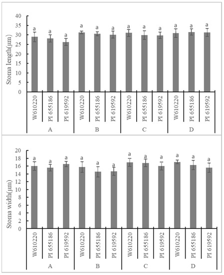 The difference of stoma length and width in awns of three accessions at four developmental stages. W610220, long awn, PI 655186, medium awn, PI 619592, short awn: (A) booting stage; (B) heading stage; (C) flowering stage; and (D) maturity stage. Error bars represent mean ± standard deviation. Different normal letters mean significant differences among different treatments at 0.05 level.