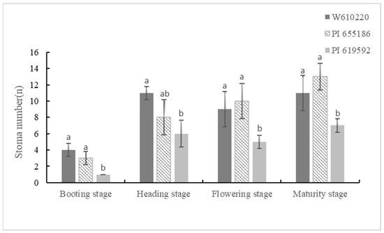 The number of stomas in the lower part of awns of three accessions at four developmental stages. W610220, long awn, PI 655186, medium awn, PI 619592, short awn. Error bars represent mean ± standard deviation. Different normal letters mean significant differences among different treatments at 0.05 level.