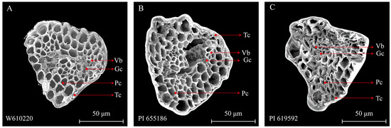 Anatomical structure image of three accessions at heading stage: (A) long awn; (B) medium awn; (C) short awn; Gc: green cells; Pc: parenchymal cells; Tc: thick walled cells; Vb: vascular bundle.
