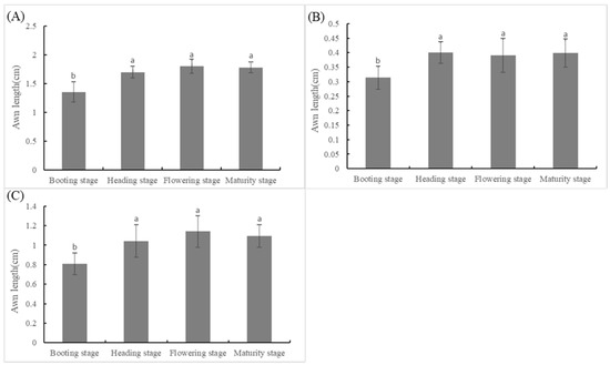 The difference of awn length of three accessions at developmental stages: (A) W610220, long awn, (B) PI 655186, medium awn, (C) PI 619592, short awn. Error bars represent mean ± standard deviation. Different normal letters mean significant difference among different treatments at 0.05 level.