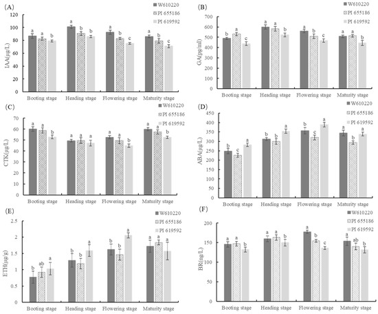 Hormonal changes of awns of three accessions at four developmental stages: (A) Auxin, (B) Gibberellin, (C) Cytokinin, (D) Abscisic acid, (E) Ethylene, (F) Brassinolide. Error bars represent mean ± standard deviation. Different normal letters mean significant differences among different treatments at 0.05 level.