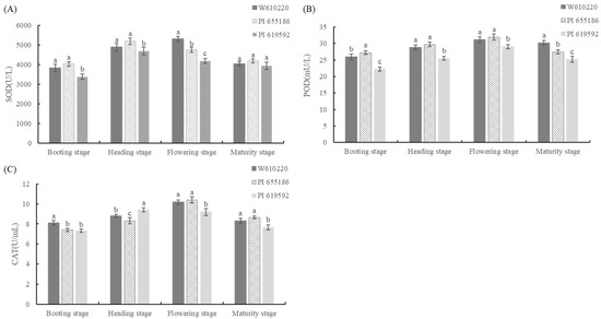 Changes of antioxidant enzyme content in awns of three accessions at four developmental stages: (A) Superoxide dismutase, (B) Catalase, (C) Peroxidase. Error bars represent mean ± standard deviation. Different normal letters mean significant differences among different treatments at 0.05 level.