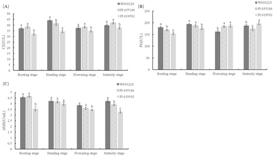 Changes of cell wall hydrolase and amylase contents in awns of three accessions at four growth stages: (A) Cellulase, (B) Polygalacturonase, (C) α-Amylase. Error bars represent mean ± standard deviation. Different normal letters mean significant differences among different treatments at 0.05 level.