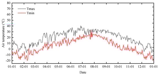 Meteorological data map of the field experiment site. The black line expresses the maximum air temperature (Tmax); the red line is the minimum air temperature (Tmin).