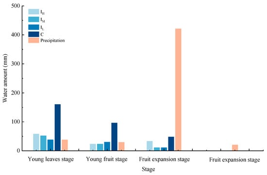 Ten-year-old golden pear trees (P. pyrifolia cv. ‘Whangkeumbae’) were used as the test material, and the rootstock is Pyrus betulifolia ‘Bunge’. Because the nutrient reserve of the tree in the previous growing season is the basis for flowering, fruit setting, leafing and develop shoots in the following growing season, we chose fruit trees with the same appearance, such as tree height and crown, for the first experimental design. The two factors of the experiment were: (1) irrigation lower levels: IH (75%θf), IM (65%θf), and IL (55%θf), and the irrigation upper limit was field capacity (θf) in all treatments; and (2) nitrogen fertilizer amounts were set to three levels: NH (486 kg·ha−1), NM (324 kg·ha−1), and NL (162 kg·ha−1). Nine water and fertilizer coupling schemes were set by orthogonal combination (Table 1). Figure 2 shows irrigation amount and precipitation at each growth stage. In this study, the local irrigation and fertilizer mode of drip irrigation with a single line was used as a C. The control treatment did not include fertilizer application, and the irrigation system was managed by the manor based on experience.