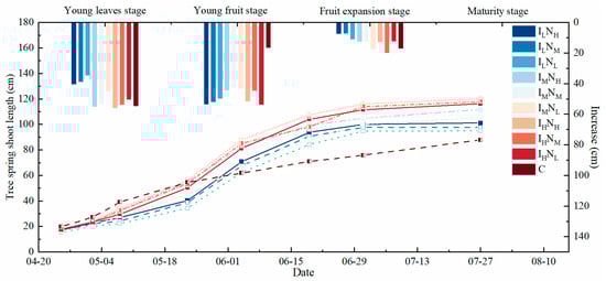 The spring shoot length growth curve during the growing period was S-shaped. The rapid growth period occurred between the young leaves stage and the young fruit stage, and difference between water and nitrogen coupling schemes occurred after the flower leaf stage (Figure 4). After the young fruit stage, the length of the spring shoot of the C and water and nitrogen coupling schemes was significantly different. The spring shoot length under IHNH, IHNM, IHNL and IMNH treatments was significantly higher than that under C, ILNH, ILNM, ILNL, IMNM and IMNL treatments. IMNM was significantly higher than that under C, ILNH, ILNM, and ILNL.