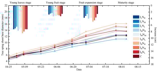 Figure 5 shows that the difference in base diameter growth of the spring shoot in schemes were not evident before the young fruit stage and began to differ afterwards. The spring shoot base diameter increased the most in young leaves stage, medium in fruit expansion stage, and the least in young fruit stage. There was no significant difference between ILNM and C, although the base diameter of spring shoot decreased under ILNM treatment. ILNH, ILNM, ILNL, IMNM, IMNL, and IHNL treatments were significantly different from IMNH, IHNH, and IHNM treatments. IMNH, IHNH, and IHNM treatments significantly increased the base diameter of spring shoot compared with other treatments. There are significant differences between ILNH, IMNM, IMNL and ILNM, IMNM, IMNL, and IHNL. The difference between ILNM and ILNL is significant, and ILNM > ILNL.