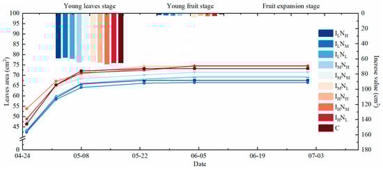 The leaf area rapidly Increased before mid-May; however, after mid-May, the increase in the leaf area slowed. The leaf area of ILNH and ILNM treatment was significantly lower than that of C, which was reduced by 7.81% and 9.21%, respectively. There was no significant difference in leaf area between ILNL, IMNH, IMNM, IMNL, IHNH, IHNM, and IHNL treatments and C treatments. In addition, IMNL, IHNH, IHNM, IHNM, and IHNL treatments were significantly different from ILNH, ILMN treatments.