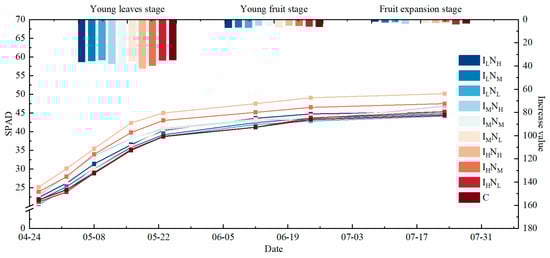 Variation of leaf SPAD during the growing season (lines) and increase among development stages (bars) under different water and fertilizer coupling schemes. The data are the mean values measured within the three repetitions (blocks). The bar is the amount of stage growth increase, the difference between the mean of the next stage, and the mean of the previous stage.