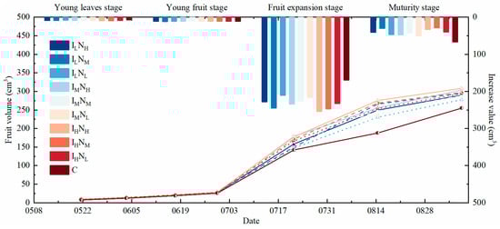 Variation of fruit volume during the growing season (lines) and increase among development stages (bars) under different water and fertilizer coupling schemes. The data are the mean values measured within the repetition (points). The bar is the amount of stage growth increase, the difference between the mean of the next stage, and the mean of the previous stage.