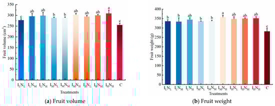 The fruit volume under IMNH was 308.46 cm3, and the minimum fruit volume under C was 255.27 cm3. Except ILNL treatment, the other water and nitrogen coupling treatments significantly increased fruit volume, which was significantly different from C. IMNH, IHNH, IHNM, ILNH, IMNM, ILNM, IHNL, and IMNL were increased by 20.84%, 18.83%, 17.45%, 17.09%, 15.80%, 15.12%, 13.09%, and 12.90%, respectively, compared with C treatment (Figure 9a). In addition, some water and fertilizer coupling schemes were also significantly different. For example, IHNH differs significantly from IMNL and IMNM.