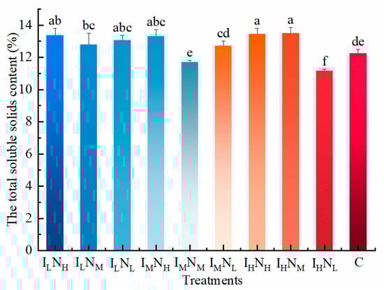 Comparing treatments in this experiment, ILNL, ILNM, ILNH, IMNH, IHNH, IHNM, and IHNL are significantly different from C. The total soluble solid content under IHNM treatment was 13.50% (Figure 10). When the nitrogen application rate is less than 250 kg·ha−1, it changed into a ‘V’ shape with the irrigation amount (Figure 11b). For fruit TSS, there was no unidirectional increase or decrease with the amount of irrigation and nitrogen application. TSS can only achieve the maximum value at the appropriate irrigation and nitrogen application rate. The minimum TSS value appeared in the elliptical area where the irrigation rate was greater than 1000 m3·ha−1 and the nitrogen application rate was less than 200 kg·ha−1. However, due to the interaction of the irrigation amount and the nitrogen application rate, when the irrigation amount was 900 m3·ha−1 and the nitrogen application rate was medium level, as shown in the elliptical area, the TSS value was relatively low.
