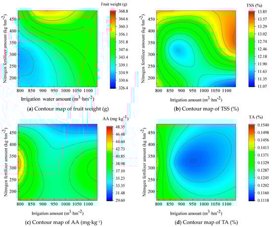 Contour map of fruit quality with irrigation amount and nitrogen application rate. (a): Change curve of fruit weight with irrigation amount and nitrogen application rate; (b): Change curve of the total soluble solid content (TSS) with irrigation amount and nitrogen application rate; (c): Change curve of AA with irrigation amount and nitrogen application rate; (d): Change curve of TA with irrigation amount and nitrogen application rate.