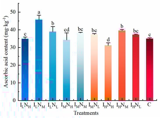 The highest AA value was observed in the ILNM treatment, an increase of 30.85% compared with the C value, while the IHNH treatment had the lowest value, which was 10.87% lower than that of C (Figure 12). The AA under ILNM treatment was 14.58 mg·kg−1 more than IHNH, and the different was significant. Comparing all schemes in this experiment, the ILNM, ILNL, and IHNH treatments were significantly different than C. When compared with C, ILNM, ILNL, and IHNM treatments increased AA in fruit, but AA of IHNH was significantly lower than C. Compared with other water and nitrogen coupling treatments, AA was significantly increased by ILNM treatment. The irrigation lower limit and nitrogen fertilizer amount significantly affected the AA of fruit, but the interaction on AA was not significant.
