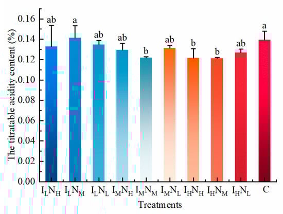 The fruit titratable acidity content (TA) is shown in Figure 13. Compared with C treatment, IMNM, IHNH, and IHNM treatment significantly reduced TA. TA content under ILNM treatment was significantly higher than the IMNM, IHNH, and IHNM schemes. The results showed that there was no significant difference in the effect of lower irrigation limit, nitrogen application rate, and interaction on TA. Too low or high irrigation and nitrogen application were unfavorable for reducing the titratable acid content in the fruit (Figure 11d). After the appropriate value (Fertilizer amount is medium level.), the titratable acid content of the fruit gradually increased. A suitable water and nitrogen coupling scheme can reduce the titratable acid content, and when the scheme is not suitable, it will lead to an increase in the titratable acid content of the fruit. The IHNM treatment was 0.1213, which was 13.05% lower than that of C.