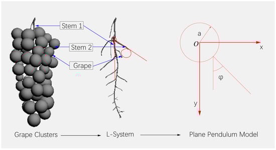 The substalks in the plane pendulum model are long and often drive the junction of the main–substems to perform circular motions. The end of the second branch stem connects a mass ball with a certain quality ; this phenomenon is mainly reflected in the swinging and falling off of the fruit during swing, and the fruit stem is not pulled off, as shown in Figure 1. The plane pendulum system includes substem l and the fruit composition. The fruit particles in the model are all isotropic grape balls; the center of the main–substem junction is taken, and the horizontal direction and vertical direction are considered as x and y, O is the junction of the main stem and the sub-stem, and a is the maximum swing range of the junction, respectively.