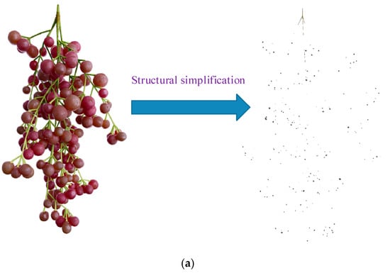 We selected large-scale grapes in South China for research, used ripe grape bunches in August as test samples, selected 100 grape bunches, and measured the geometric size and shape of the research object. The picking target was N: 23°09′ E: 113°, where there were four-year-old summer black grapes in the open air near 16′. The grape ripening process is accompanied by changes in stem diameter, length, and berry maturity [26,27,28]. The parameters are shown in Table 1. By considering the purpose of the ripe grape picking experiment, the mean data of the ninth week and the tenth week with the highest and second highest maturity were selected as the experimental modelling material object. The grape system was composed of cobs and berries, and the cobs were regarded as skeleton network structures with several branches and a main branch. Unlike normal fruits, bunches of grapes are multi-berry squeezed fruits. The junction of the berries with the tip of the stalk is extremely soft; the experiments were conducted immediately after the bunches were harvested to maintain the elasticity between them.