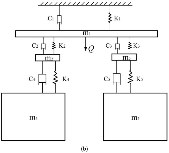 The main cob is connected to the vine through springs and dampers and to the subcobs on the left and right; the particles on the left and right sides are simplified into two mass blocks. Thus, a spring-five-mass-damping system is established, as shown Figure 2b, C stands for damping, K stands for stiffness, m stands for mass, and Q stands for vertical excitation.