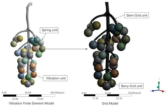 The fit between the simulation model and the actual picking determines the accuracy of the simulation results. In this paper, Dassault Systemes Solidworks 2019 sp5.1 was used to establish the three-dimensional model of the main stem–stem–berry of the grape fruit–cob system; the grape model was imported into Ansys Workbench for modal, frequency sweep, and random vibration processing. First, we set the material properties and physical properties of the fruit stem. Under forced vibration, the dynamic behavior of the grape fruit shows different swing patterns and shedding, and it occurs at the end of the stem; thus, a spring connection was set between the stem and the end of the berry. In this study, the stem and berries were set as near-rigid bodies, and the berries were set as linear elastic spheres. The grape fruit–cob system obtained in the simulation process was quite different from the real situation; thus, it was an indispensable step to continuously assign new material parameter values to continuously correct and modify the grape model [29,30]. The simulation model was divided into precise meshes by unit parts, and each part was connected by nodes. The weight of the whole bunch of grapes was near the experimental value; the quality of each component remained unchanged during the simulation process, making the grape model more accurate. Since it is difficult to observe the microscopic deformation of cobs and berries in the actual picking process, only the macroscopic swinging and shedding results are seen; thus, setting the stress in the dynamic simulation produced deformation.