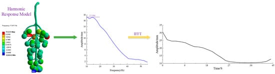 The harmonic response analysis showed that under the frequencies of cutting fruit stems, grape bunches showed different dynamic responses. The displacement change curve under the extracted dynamic response is shown in Figure 5. Approximately 11.41 Hz was the key mode of grape bunch berry swinging, greatly influencing the structure. The key mode of the fruit–stalk system was 11.41 Hz; the maximum deformation of the berry reached 11.57 mm, at which time the fruit–cob system reached resonance. The frequency domain curve shows that the amplitude of the vibrated berry gradually decreased as the response frequency gradually increased, reaching a maximum swing displacement of 17.3 mm at 10.49 Hz; the swing amplitude of the berry after 10.49 Hz was submerged. After 40 Hz, the amplitude in berries with the maximum vibration amplitude gradually decreased in a smooth manner, which is consistent with the law of amplitude changes studied by previous researchers; however, there were some differences in where and when the maximum amplitude occurred. This phenomenon was seen in the time domain curve, indicating the gradual completion of the picking cycle.
