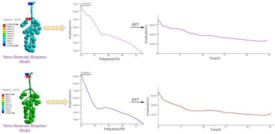 The dynamic response of the berry is the macroperformance of the grape bunch and the compound of the microvibration response in the X and Y directions. During the vibration process, the berries continued to show different amplitudes of shaking, jumping, and rebounding at different stages. This phenomenon was related to the excitation frequency, shear force, and other factors, such as the sizes and locations of grape berries. As shown in Figure 6, the frequency domain curve was extracted through the X-direction stress response model, and it was found that the maximum amplitude of the berries reached 3.74 × 10−10 mm when it approached 10 Hz and then decreased to 0 Hz. Collisions between the berries occurred in the X direction; when the binding force at the fruit pedicle did not sustain this collision force continuously, the berries broke away from the end of the stalk and dropped. If the collision force causes the generated stress to superimpose instantaneously, it causes the instantaneous stress loss of the fruit stem to exceed the maximum stress of its material; the fruit cob may suddenly break and fail. The time-domain curve extracted by the inverse fast Fourier transform (IFFT) showed that the amplitude gradually decreased with the progress of the picking cycle, which is in line with the actual picking situation. According to the frequency domain curve extracted by the stress response model in the Y direction, when the frequency was approximately 10 Hz, the vibrating berries produced a swing displacement of 2.88 × 10−9 mm that then gradually decreased to 0. The comparison showed that at the same frequency, the amplitudes of the berries in the Y direction were larger than those in the X direction, and the corresponding berry vibration response was more intense; thus, the jumping and rebounding phenomena were mostly the main phenomena. The response process may be accompanied by torsion and fracture of the cob, affecting the stress state of the grape bunch in the vertical direction; individual berries may jump and the whole bunch of grapes may fall. In the stage of theoretical analysis and modeling, spherical berries and linear elastic fruit stems were set as a unified complex with different elastic moduli. Vibration simulation experiments showed that berries had similar laws in the X and Y directions. The IFFT of the frequency domain curve of the vibrated fruit showed that after the excitation of the vibrated fruit reached its maximum value, it began to decrease until it stopped, which was consistent with the dynamic response of the berry in the X direction.