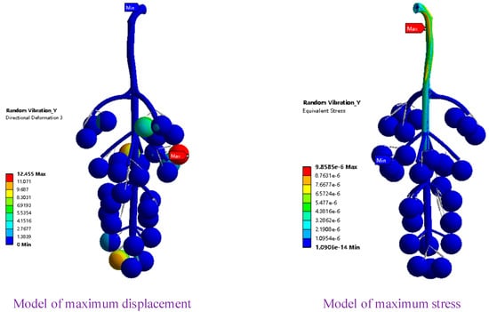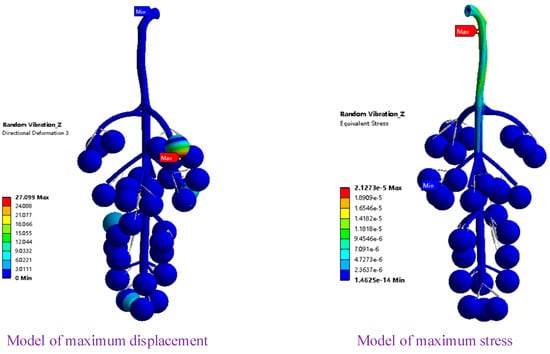 As shown in Figure 7, through the random vibration analysis of grapes in the X direction under excitation, both the cob axis and the berries vibrated randomly. The berries with the largest displacement appeared on the right side of the upper end of the grape bunch. The exciting force transmitted to the berries from top to bottom caused the berries to produce a detachment force in the horizontal direction that exceeded the fruit-pedicle connection force; the detachment force caused the berries to fall irregularly. In this process, the berry excitation caused by the cob excitation locally caused a sudden change in the berry stress, and the maximum stress reached 3.37 × 10−5 MPa, which appeared mostly at the upper end of the main cob. However, the strength of the main cob was relatively large, and the structure was not damaged.