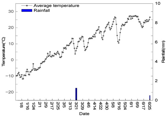 The study was conducted in 2021–2022, at the experimental station of the College of Agriculture, Tarim University, Xinjiang (80°30′ N, 40°22′ E; 1100 m above sea level). The climate type is warm continental arid desert with low precipitation, and the agriculture is primarily irrigated. Meteorological data (Figure 1) were obtained from the National Meteorological Information Center (China) [18]. The soil is loamy, with a tillage layer of 0–20 cm, with the following base fertility levels: organic matter = 10.8 g·kg−1, alkaline nitrogen = 29.2 mg·kg−1, available phosphorus = 18.5 mg·kg−1, and fast-acting potassium = 132 mg·kg−1. Prior to land preparation, organic fertilizer (2250 kg·ha−1) and compound fertilizer (19%, 20%, and 6% of N, P, and K, respectively) (375 kg·ha−1) were applied as a base fertilizer.
