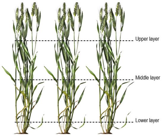 During the mid-filling stage, the MTA was measured in the horizontal dimension (for the middle row of each plot), and in the vertical dimension in the upper (flag leaf), middle (second leaf from top), and lower (5 cm above the ground) layers (Figure 3). MTA was measured using a plant canopy analyzer (LI-COR 2200C).