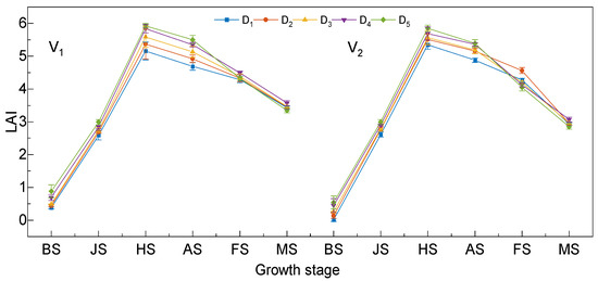 3.1. Effects of Planting Density on LAI