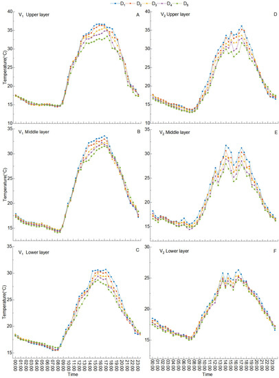 Canopy temperature strongly influences the duration of grain filling [19,20,21]. In our study, diurnal canopy temperature fluctuations varied with planting densities (Figure 5). Specifically, the two varieties exhibited the same patterns of canopy temperature fluctuation in the different layers. The canopy temperature decreased from midnight and increased from 8:00, then gradually decreased after peaking between 16:00 and 17:00.