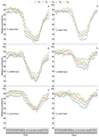 Effects of planting density on canopy relative humidity in uniformly sown winter wheat. V1, Xindong 50. V2, Sangtamu 4. (A–C) denote the upper, middle, and lower layers of Xindong 50, respectively, whereas (D–F) refer to the upper, middle, and lower layers of Sangtamu 4, respectively.