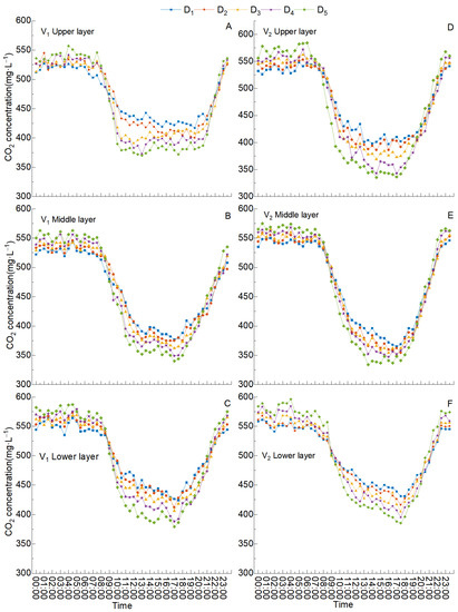 In our study, we investigated the effects of planting density on canopy CO2 concentrations (Figure 7). In both varieties, the canopy CO2 concentration was the highest in the lower layer, intermediate in the upper layer, and lowest in the middle layer. CO2 concentrations differed considerably between the day and night. Specifically, CO2 concentrations were relatively constant at night, and highest during the high-density treatment. CO2 concentrations gradually decreased from 8:00, reaching a minimum at 16:00–17:00. For both varieties, CO2 concentrations decreased with increasing density in all layers. Upper layer CO2 concentrations varied significantly with density, whereas middle layer CO2 concentrations showed relatively little variability.