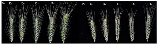 Effects of planting density on the spikes of uniformly sown winter wheat. V1, Xindong 50. V2, Sangtamu 4. D1–D5 refer to 123 × 104, 156 × 104, 204 × 104, 278 × 104, and 400 × 104 plants·ha−1 planting densities, respectively.
