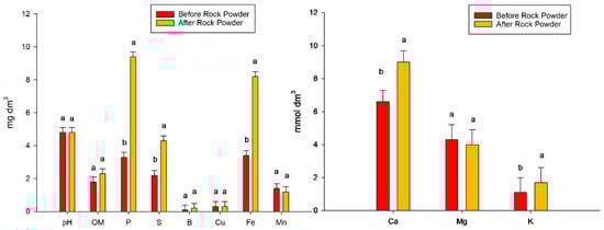 The rock powder was acquired directly from its manufacturer. The brand was Coplan, produced in the Embaúba city of Sao Paulo State, Brazil. Rock powder is a residue of basalt rock extraction and has properties that improve some soil properties []. The rock powder composition was SiO2 = 43.7; Al2O3 = 16.3; Fe2O3 = 9.2; Na2O = 3.4; MgO = 6.2; K2O = 3.4 and TiO2 = 3.4, and the chemical and physical attributes of the soil before rock powder application and after rock powder application are shown in Figure 2.