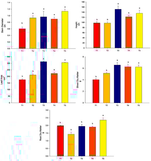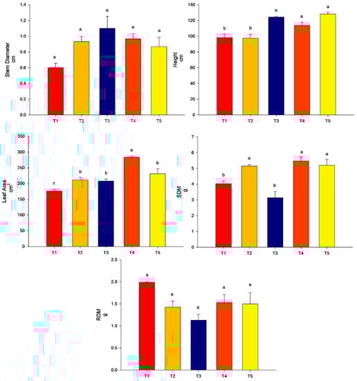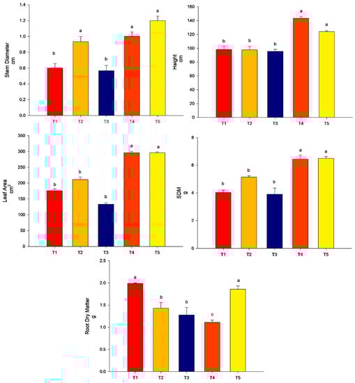 All the treatments promoted stem diameter more than the control (p < 0.05). For the height of plants and leaf area, the highest values were found for treatment T3 (conventional fertilization (100%) + B. subtilis) and T5 (conventional fertilization (50%) + rock powder + B. subtilis) (p < 0.05). The treatments T2 (conventional fertilization (100%) + rock powder) and T4 (conventional fertilization (100%) + rock powder + B. subtilis) did not differ from the control (p > 0.05). For the SDM, the lowest treatment was found for T2 (conventional fertilization (100%) + rock powder) and did not differ from that of the control (p > 0.05). The other treatments, T3 (conventional fertilization (100%) + B. subtilis), T4 (conventional fertilization (100%) + rock powder + B. subtilis), and T5 (conventional fertilization (50%) + rock powder + B. subtilis), were higher than the control (p < 0.05). For the RDM, the highest value was found for T5 (conventional fertilization (50%) + rock powder + B. subtilis). The other treatments did not differ from the control (p > 0.05) (Figure 4).