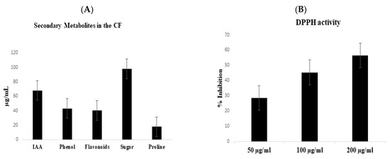 Figure 1. (A) Secondary metabolites in the CF of P. lilacinus. IAA = Indole-3-acetic acid, Phe = phenolic and Flav = flavonoids, proline and sugar contents. (B) Represents DPPH free radical scavenging activity of the CF of P. lilacinus.
