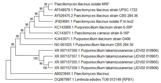 Figure 2. Phylogenetic tree of P. lilacinus (MRF). The evolutionary history was inferred using the Maximum Parsimony method. Tree #1 out of 10 of most parsimonious trees (length = 576) is shown. The consistency index is 1.000000, the retention index is 1.000000, and the composite index is 1.000000 for all sites and parsimony-informative sites (in parentheses). The percentage of replicate trees in which the associated taxa clustered together in the bootstrap test (100 replicates) are shown next to the branches. The MRF tree was obtained using the Subtree–Pruning–Regrafting (SPR) algorithm with search level 1, in which the initial trees were obtained by the random addition of sequences (10 replicates). This analysis involved 14 nucleotide sequences. There were a total of 1065 positions in the final dataset. Evolutionary analyses were conducted in MEGA X.