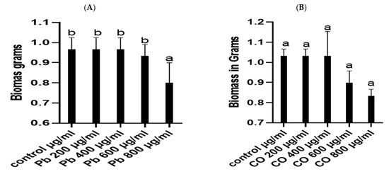 The growth of P. lilacinus was checked in the Czapek broth containing 200, 400, 600 and 800 µg/mL of Pb. The weight of the fresh biomass under cobalt stress was unaffected at 200 and 400 µg/mL, i.e., 0.966 g; meanwhile, when increasing the concentrations up to 600 µg/mL, a slight change was observed, i.e., at 0.933 g, while at 800 µg/mL (0.8 g), a significant decrease in the weight of the biomass was noted (Figure 3A). The growth of P. lilacinus was also checked for CO stress. The lower concentrations were unable to decrease the weight of the biomass, while higher concentrations of Cobalt (600 and 800 µg/mL) decreased the weight of the biomass (Figure 3B).