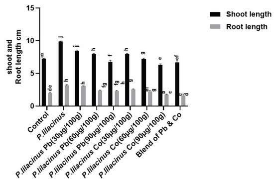 P. lilacinus (MRF) has significantly increased the shoot length of S. lycopersicum, 9.86 ± 0.08 cm, and root length, 3.16 ± 0.12 cm, as compared to control plants of 7.23 ± 0.22 cm and a root of 2.03 ± 0.03 cm. These results are supported by the findings of Khan et al., [57], in which plant growth parameters such as shoot length, root length, dry biomass, leaf area and chlorophyll content were found to be higher in the inoculated RSF-6L plants than in non-inoculated or Cd-free plants [58]. Similarly, Khan and Lee [58] also revealed that the endophyte P. funiculosum symbiosis reduced the Cu stress and improved the soybean plant growth; these positive effects are attributed to their ability to release bioactive gibberellins. Proline plays a vital role in plants. It protects the plants from abiotic stresses as well as recovering plants from stress more quickly and is also known for enhancing enzymatic activities. Proline scavenges the ROS produced in plants under numerous biotic and abiotic stresses [59]. Sometimes, the ROS is produced in the absence of stress and becomes scavenged by naturally occurring antioxidants, such as proline; the stress conditions cause an imbalance of the ROS and antioxidants produced in cross-protection [60]. In our study, the significant increase in the proline content was noticed in the lead- and cobalt-stressed S. lycopersicum, as compared to the control untreated plants. The application of P. lilacinus has resulted in 15.80 µg/mL of proline, which is double the control plants (7.31 µg/mL). Similar results have been reported by Saradhi [61]. Our study is also in accordance with that of Ikram et al., [5]; in their study, an increase in the proline content in wheat plants inoculated with the endophytic fungi, Penicillium ruqueforti, occurred more often compared to non-inoculated plants.
