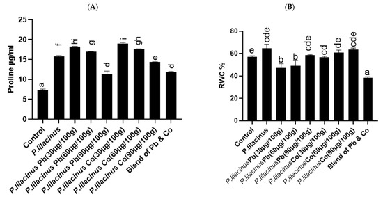 Figure 5. (A) Effect of lead and cobalt stresses on proline of S. lycopersicum inoculated with P. lilacinus and without P. lilacinus. Bars represents mean of triplicates with ±SE. Alphabets above the bars are significantly different from one another at p ≤ 0.05. (B) Effect of lead and cobalt stresses on RWC of S. lycopersicum inoculated with P. lilacinus and without P. lilacinus. Bars represents mean of triplicates with ±SE. Alphabets above the bars are significantly different from one another at p ≤ 0.05.