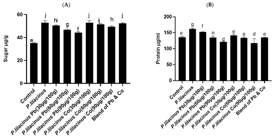 Figure 6. (A) Effect of lead and cobalt stresses on sugar of S. lycopersicum inoculated with P. lilacinus and without P. lilacinus. Bars represents mean of triplicates with ±SE. Alphabets above the bars are different significantly from one another at p ≤ 0.05. (B) Effect of lead and cobalt stresses on protein of S. lycopersicum inoculated with P. lilacinus and without P. lilacinus. Bars represents mean of triplicates with ±SE. Alphabets above the bars are different significantly from one another at p ≤ 0.05.